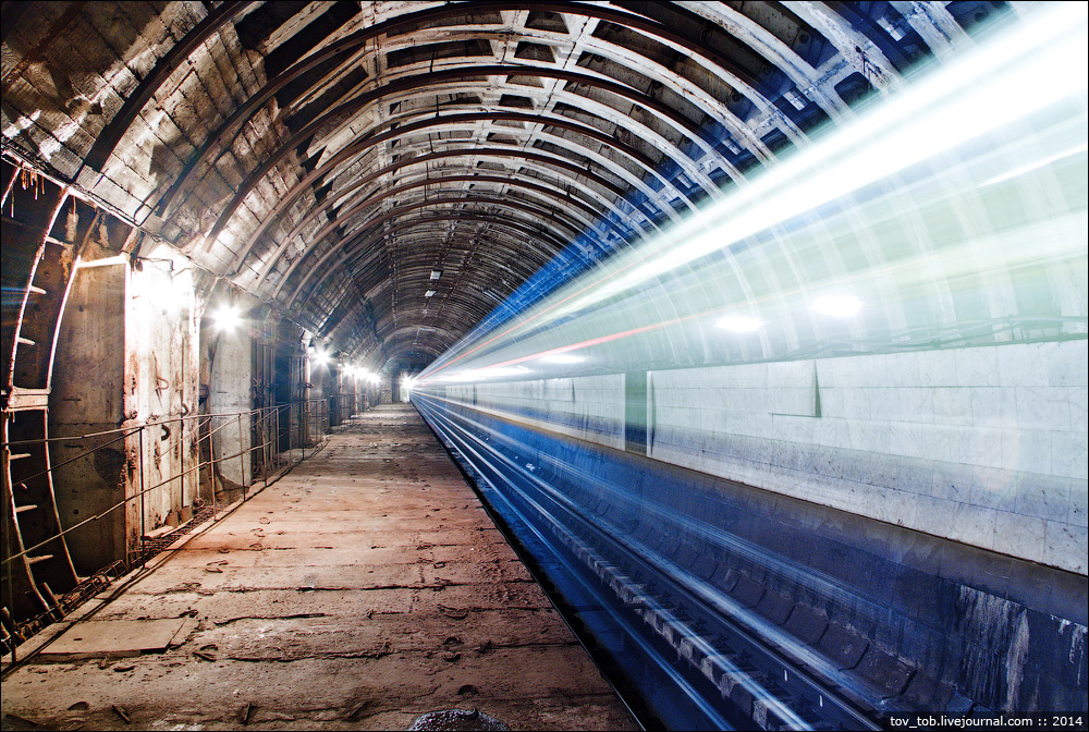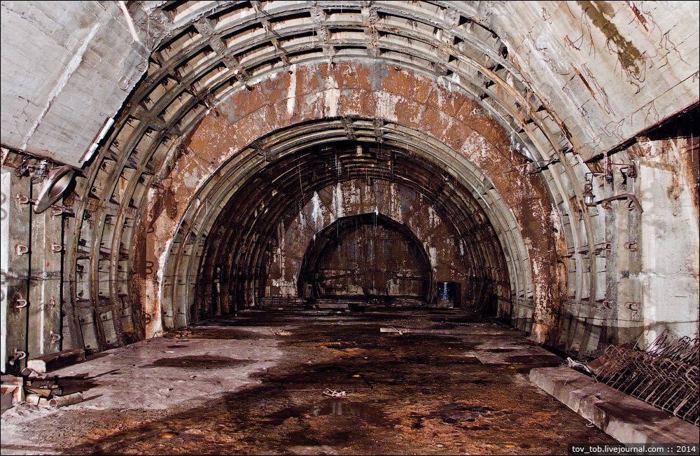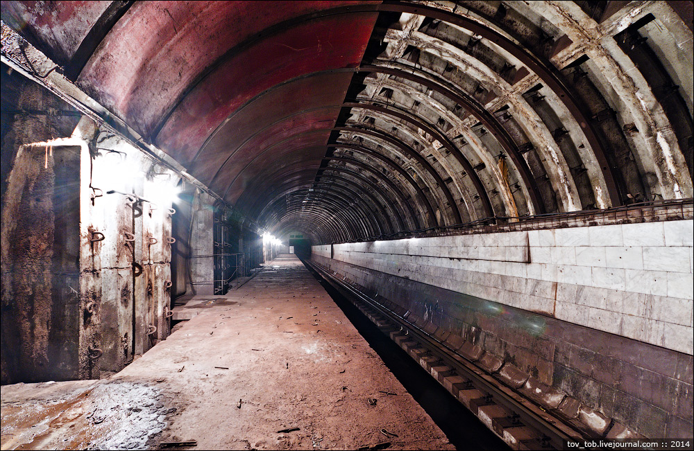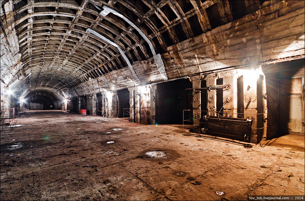 13. Центральный зал станции готов полностью, но отделки тут пока нет. В тишине между проезжающими поездами слышно, как со свода на платформу падают редкие капли воды.