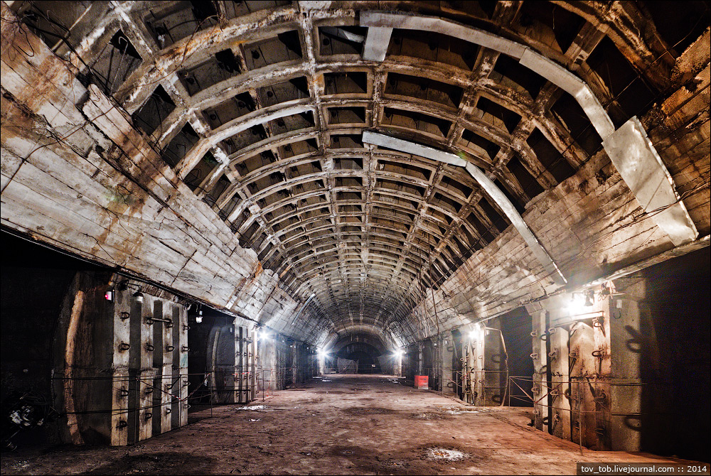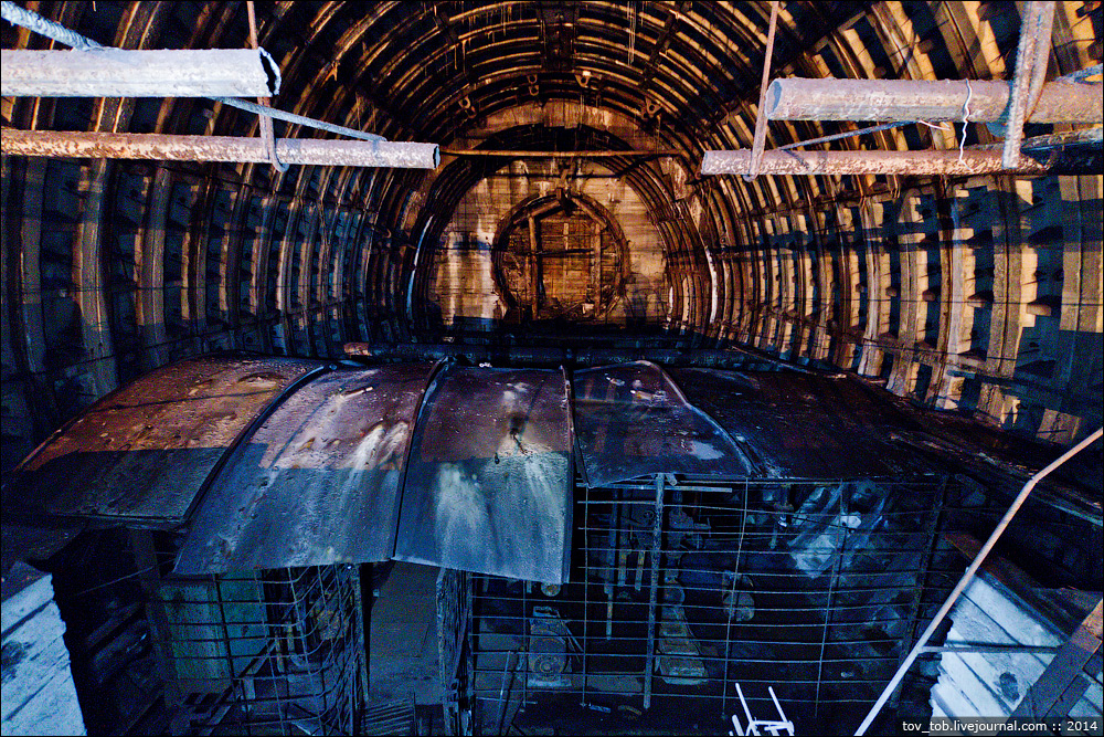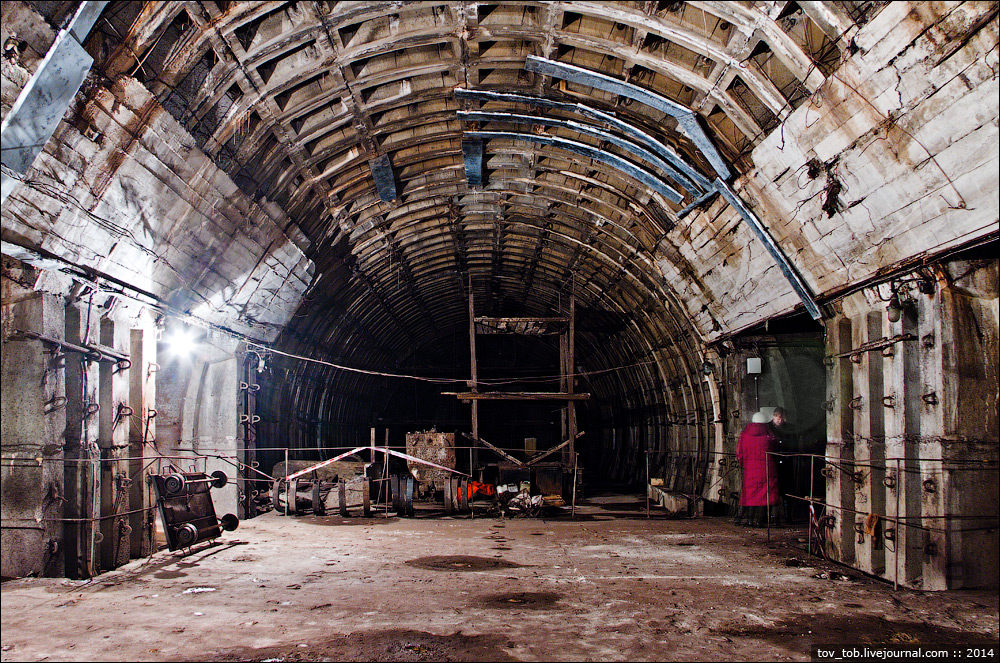 16. Глухой торец центрального зала. Чтобы торец не выдавило внутрь горным давлением, он выполнен не одной стенкой "во весь рост", а в виде "ступенек" с помощью обделок разного диаметра. Во время отделки все это хозяйство закроют фальш-стеной.