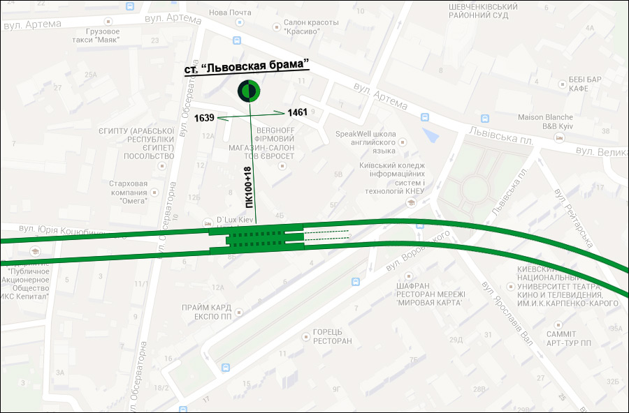 19. Территориально станция расположена под дворами рядом со Львовской площадью. Расстояние от "Львовской брамы" до "Золотых ворот" - 1461 м; до "Лукьяновской" - 1639 м. Глубина заложения около 90 м.