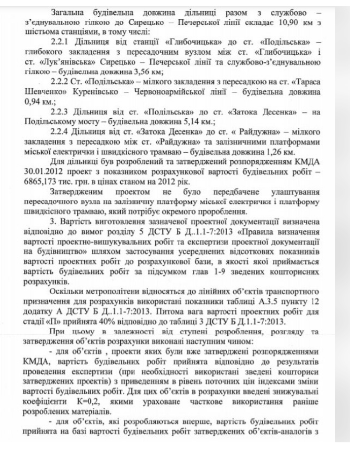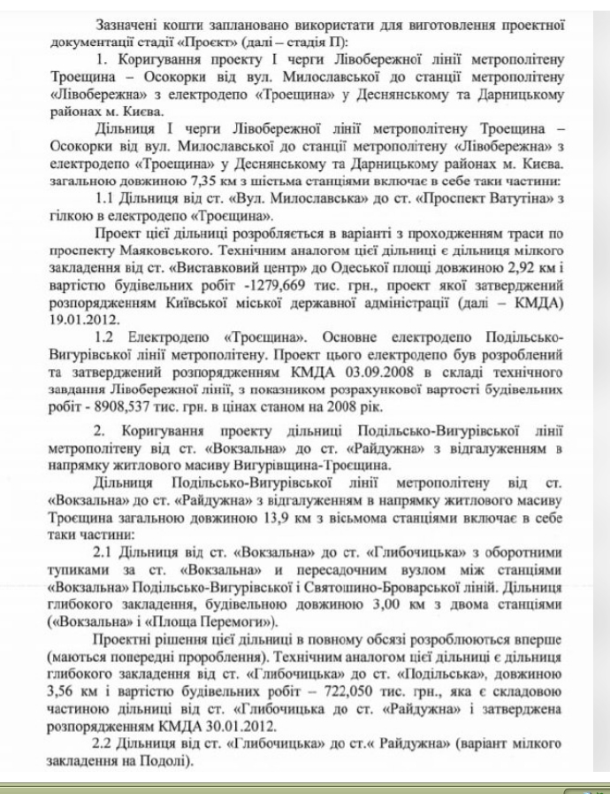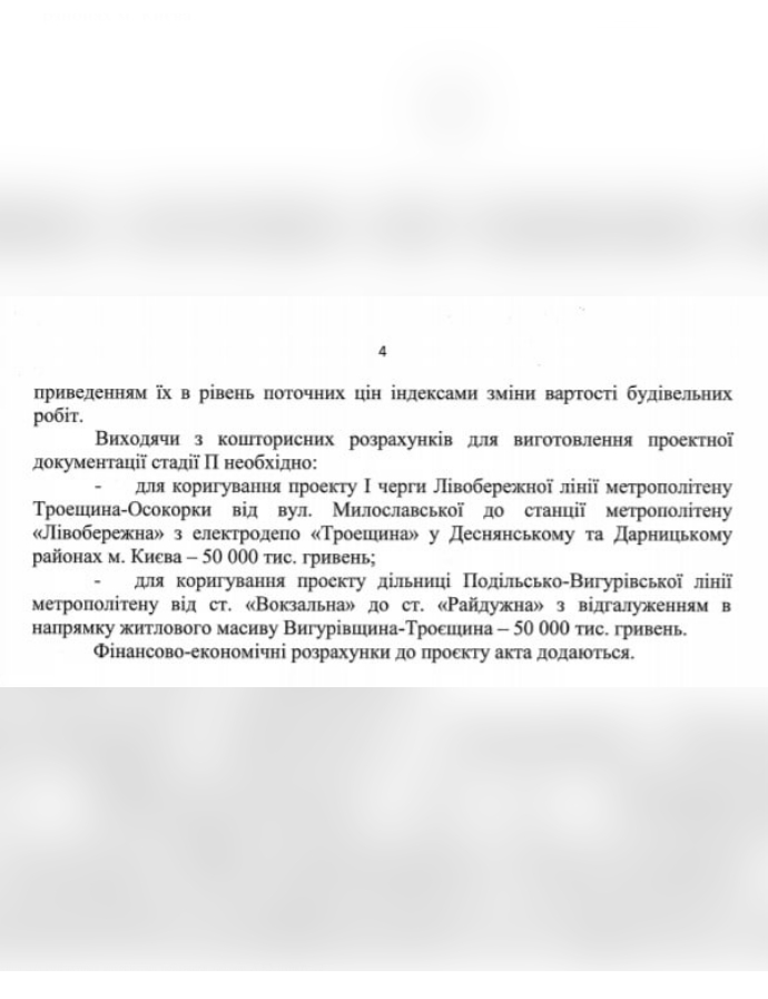 Така ж сума - 50 млн грн - піде на коригування проекту дільниці Подільсько-Вигурівської лінії метрополітену від станції “Вокзальна” до ст. “Райдужна”.