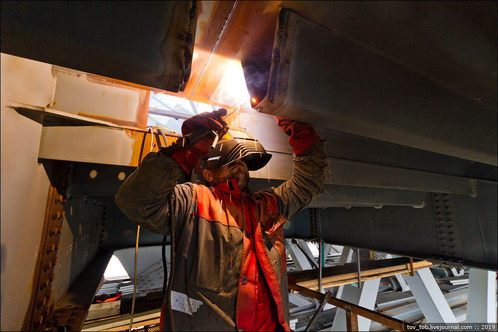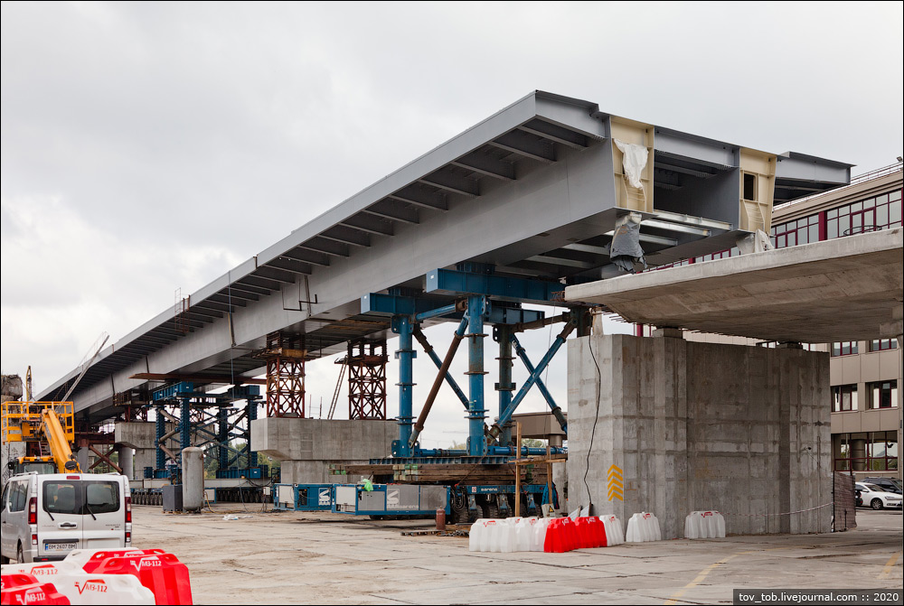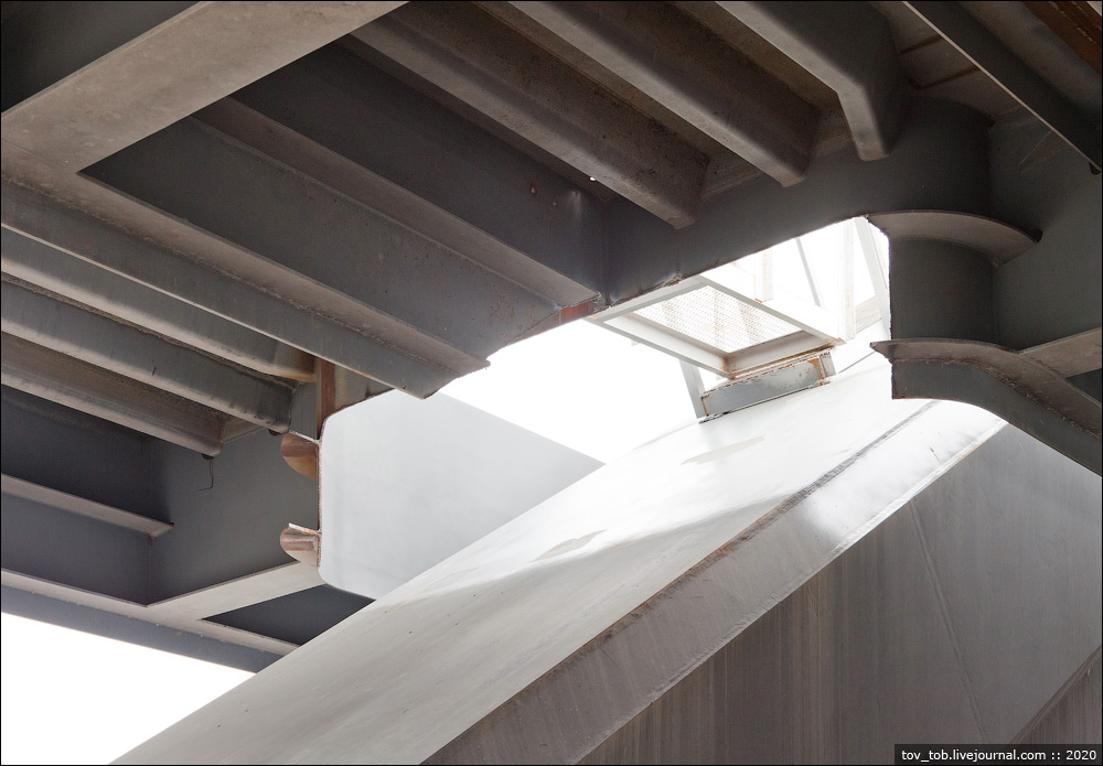 77. А это уже установленный на место пролет. Видно, что в месте стыка типовая для этой конструкции длинная балка была разрезана на две части и таким образом получилось два разных пролета. Это артефакт от проекта классической надвижки: вся разметка балок и остального металла остались от предыдущего проекта. От него же осталось и огромное число болтовых соединений, которые видно на фото.