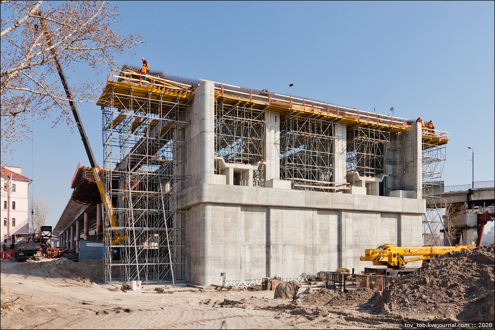108. К апрелю прошлого года практически все опоры, построенные на сегодня, уже были готовы. А также начала зарождаться низовая опора устоя эстакады (опора №1).