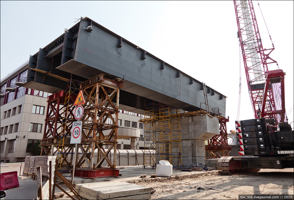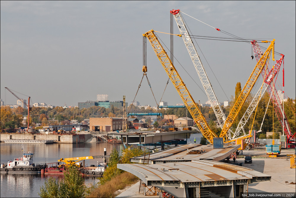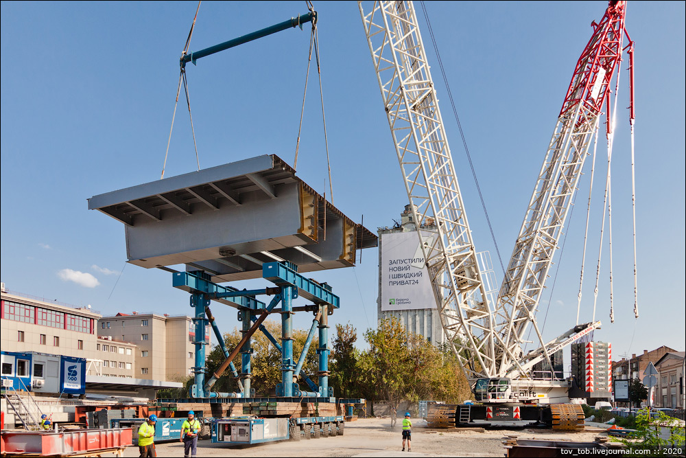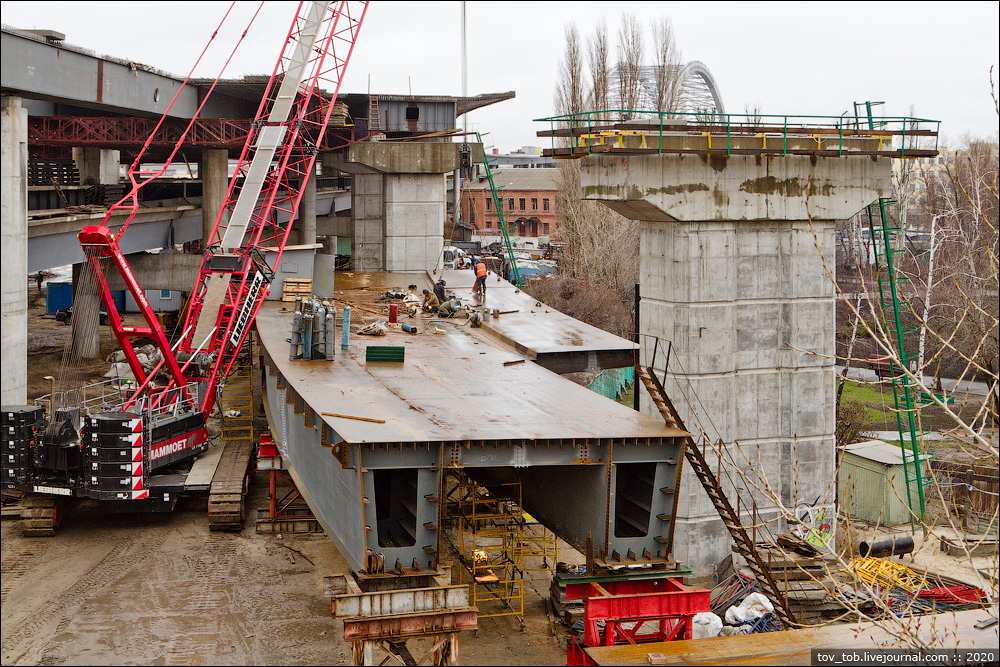 Основная прелесть у этой схемы - можно собрать большие крупные блоки пролета в совершенно ином месте и просто привезти их на площадку. У классической надвижки таких возможностей нет. Но в отличие от классической надвижки, которая позволяет затолкать пролет сразу через всё русло Гавани, мультивиллерами так сделать не выйдет. Поэтому пролеты через русло предполагалось собрать на специальной площадке у Кузни и монтировать с воды с помощью понтона. С точки зрения экономия времени - это хорошая схема, ведь многие работы можно проводить параллельно. И тут нужно напомнить, что в 2018 году был разработан вариант строительства заезда именно с помощью классической надвижки. По всем срокам (которые были напрочь потеряны в течение 2019 года) обычная надвижка позволяла без излишних телодвижений и крупной техники (мультивиллеров, понтонов, сноса старого моста, обустройства новой площадки у Кузни и т.д.) построить этот заезд к лету 2020 года. Но сначала были сорваны все сроки, потом сменился подрядчик и на обычную надвижку времени уже не было. Еще год назад казалось, что несмотря на увеличение сметы и ряд скандалов, параллельная сборка пролетов на Подоле и у Кузни позволит хотя бы нагнать сроки.К концу весны работы на этом участке внезапно остановились примерно на три месяца. Причины здесь были совсем не такими, как на других участках. Дело в том, что голландский Мамут, который так сильно хотел получить подряд на этот объект, в какой-то момент просто ушел со стройки, окончательно сорвав сроки строительства заезда. Это было одновременно смешно и грустно. Они так долго пробивались сюда в 2019 году, став одной из причин замены надвижки на крупноблочную сборку с помощью их техники. А тут просто взяли и ушли. И ушли не просто так, а потому что им надоел беспросветный организационный бардак, который царил на стройке (хотя по моему мнению, они вполне знали, во что ввязываются).