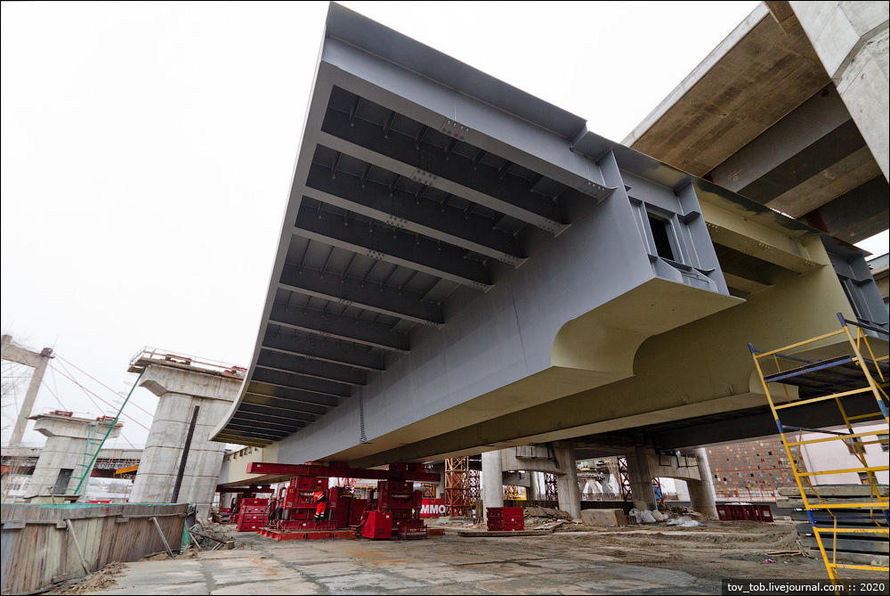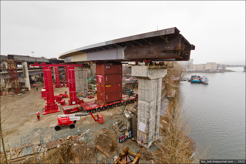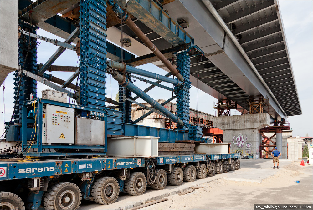 33. На финальном этапе пролет был поднят на высоту около 15 метров с помощью четырех 500-тонных домкратов, путем многократного наращивания домкратных площадок. А затем перемещен мультивиллерами с помощью нехитрой конструкции из усиленных контейнеров.