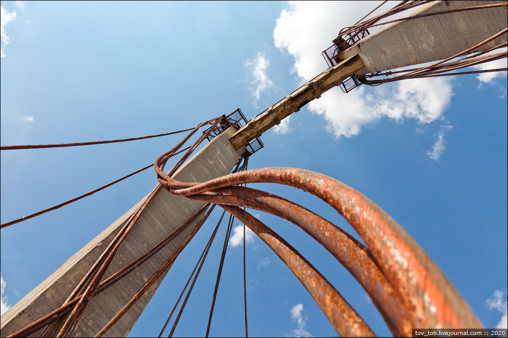 43. По соседству с заездом находится старый вантовый мост. От него уже давно откусывали пролеты со стороны Рыбальского, а в прошлом году начался демонтаж и со стороны правого берега. О его судьбе и всех причинах демонтажа можно почитать по ссылке, здесь же я подробно на этом останавливаться не буду.