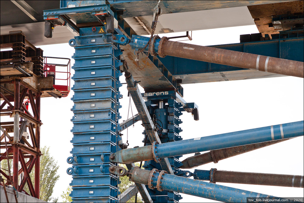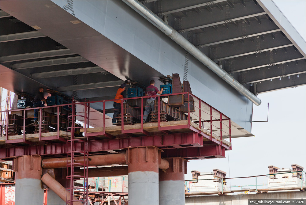 15. Начался сложный и долгий процесс опускания пролета моста в проектное положение. Напомню, что он при монтаже находился на 90 см выше проектного положения. В том числе для того, чтобы облегчить монтаж вант.