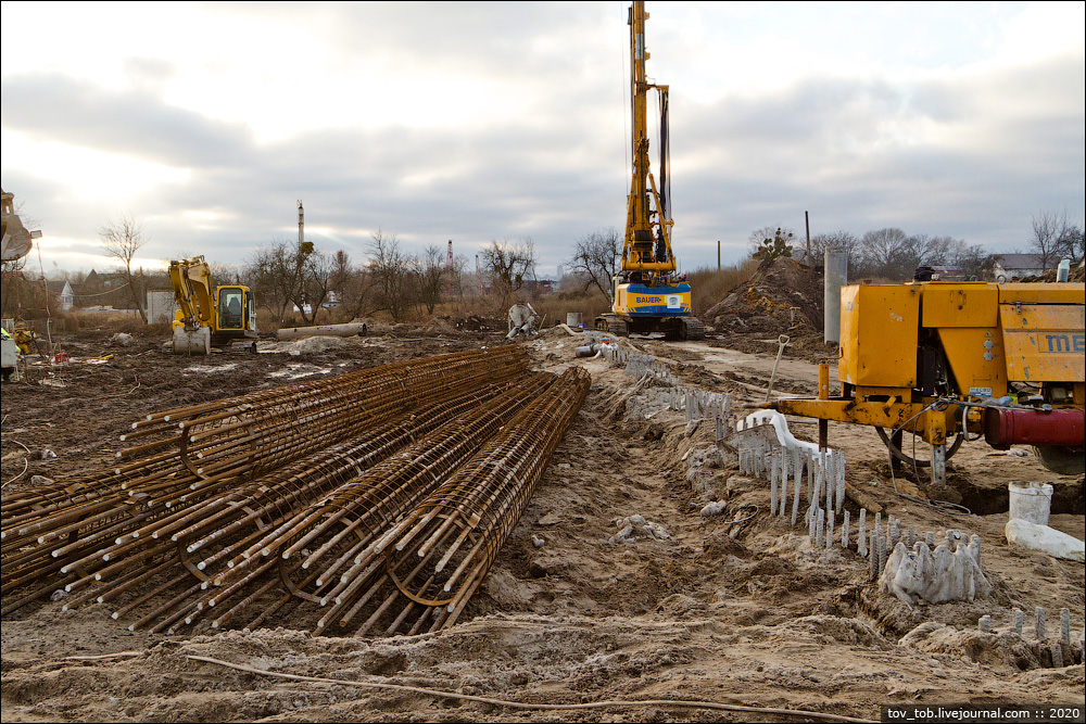 105. Строительство стены в грунте активно велось до середины весны, потом наступил карантин и работа остановилась. А потом наступило понимание, что денег не будет и буровики окончательно съехали с этого участка, хотя стену в грунте тут еще строить и строить. Как вы уже догадались, последние два фото - это снова октябрь 2020 и с тех пор в этом пейзаже лишь незначительно изменилась высота насыпи. Таким образом, большую часть года этот кусочек стройки простаивал.
