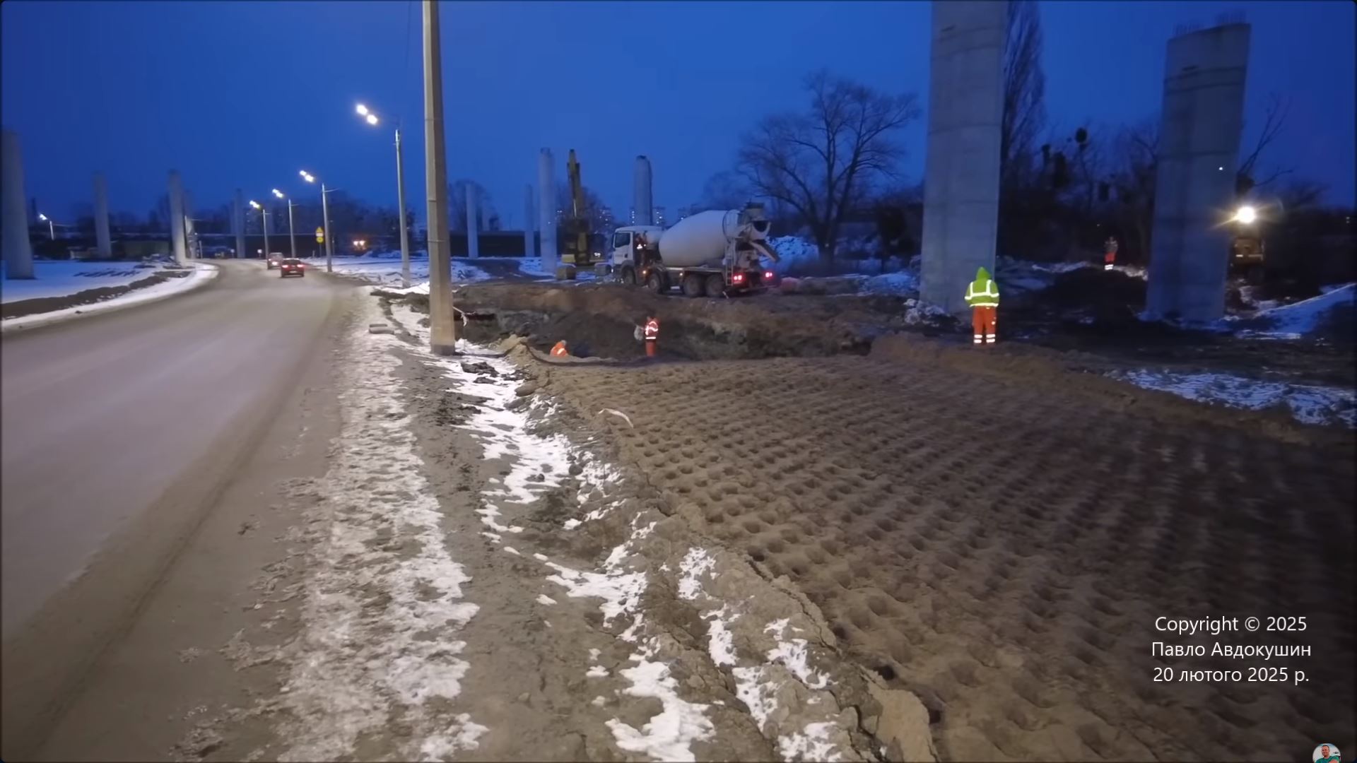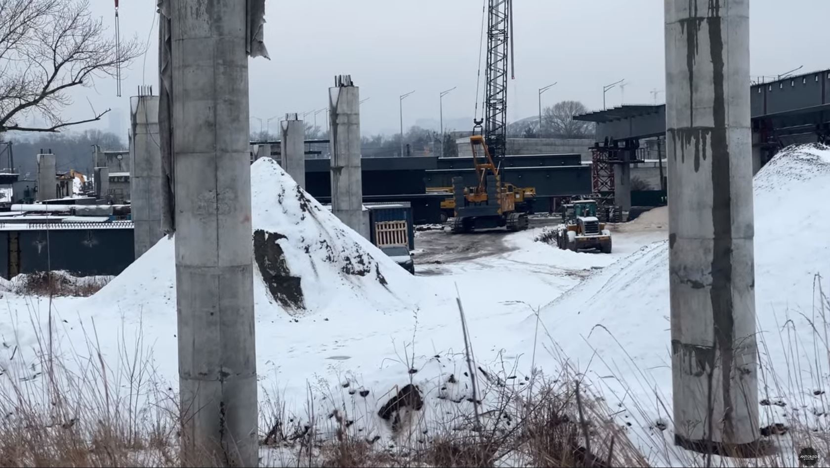 Будівництво з'їзду в бік Троєщини з Подільсько-Воскресенського моста (Київ). 06.02.2024