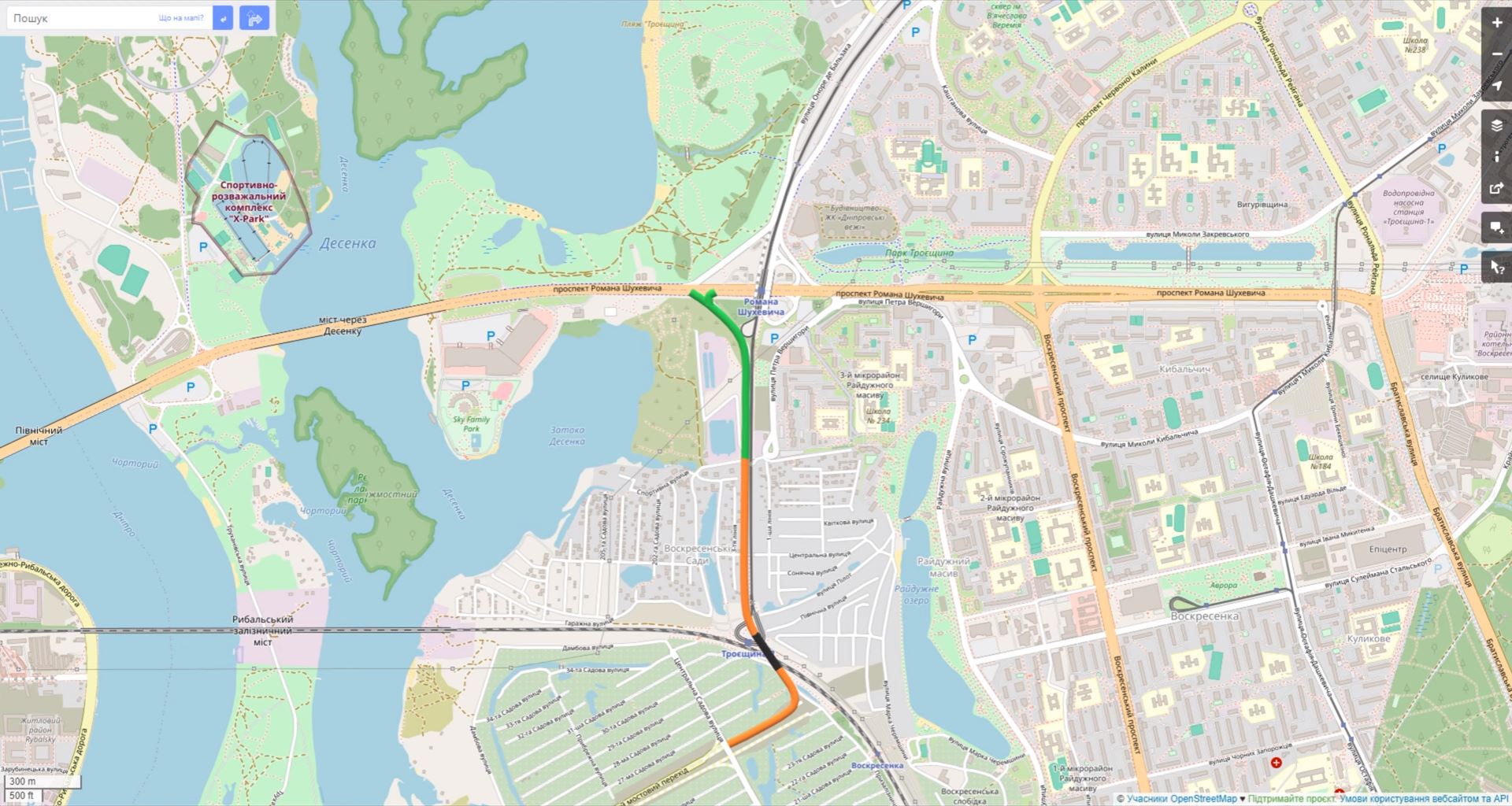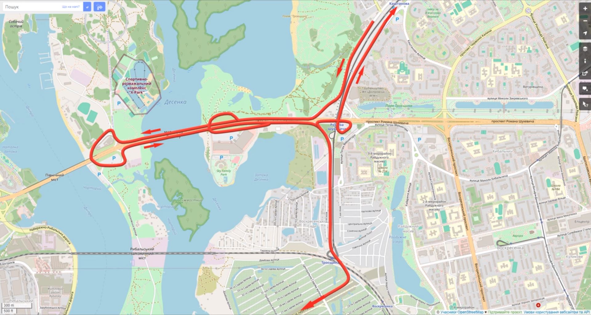 - Подільсько Воскресенський мостовий перехід проїзд, з таймінгом, з вул. Набережної Хоещатицької на Подолі до пр. Романа Шухевича.