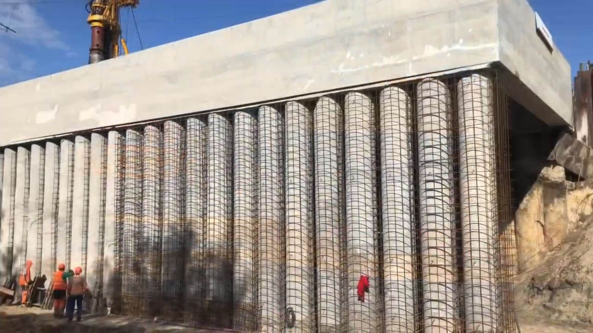 систему водоотвода и освещения и бетонируют подпорные стены на выезде.